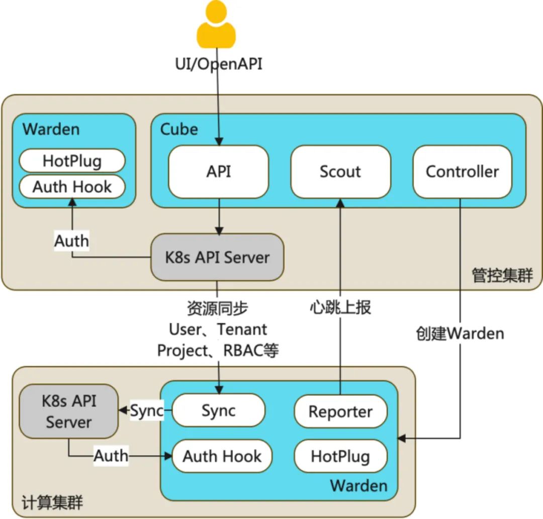 Warden 的资源同步管理器会将 user cr 以及 RBAC 规则从管控集群同步到计算集群