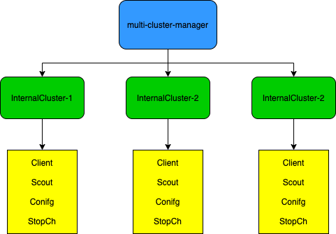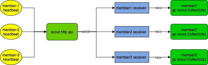 scout 的职责是侦查指定集群的健康状况,它对外提供 http 接口来接收来自不同集群的心跳,随后将心跳包发送到对应的 scout 的 Receiver channel 中,对内则是起了一个 goroutine 循环接收来自 Receiver channel 的心跳包,并且根据健康和超时两种情况做不同的 callback 处理。