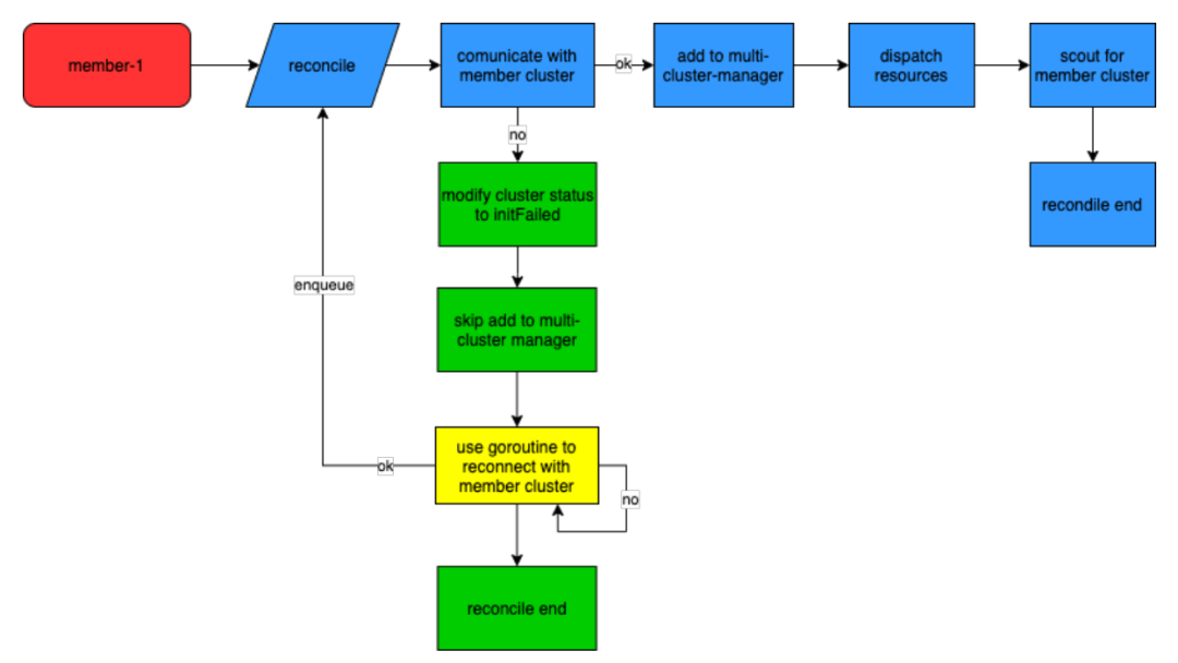 初始化失败的集群会在一个单独的 goroutine 中进行定时重试重联操作,并将重连成功的 cluster 通过 K8s 的 GenericEvent 重新做 reconcile,同时会在重试队列中删除该重试任务。重试超时默认为 12h,重试间隔为 7s。