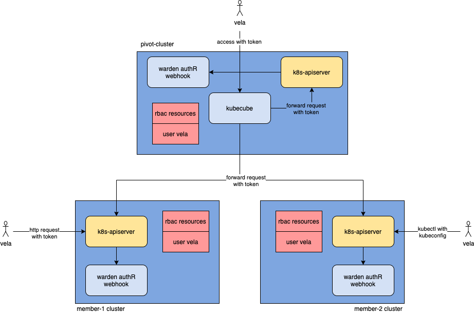 参数去访问 warden 的 authR webhook api,并获取认证结果,比如持有 vela 的 token:xxxx,去访问 warden 的认证服务后,得到 vela 这个 user然后 k8s-apiserver 通过 vela user,以及与之匹配的 rbac 规则作为鉴权