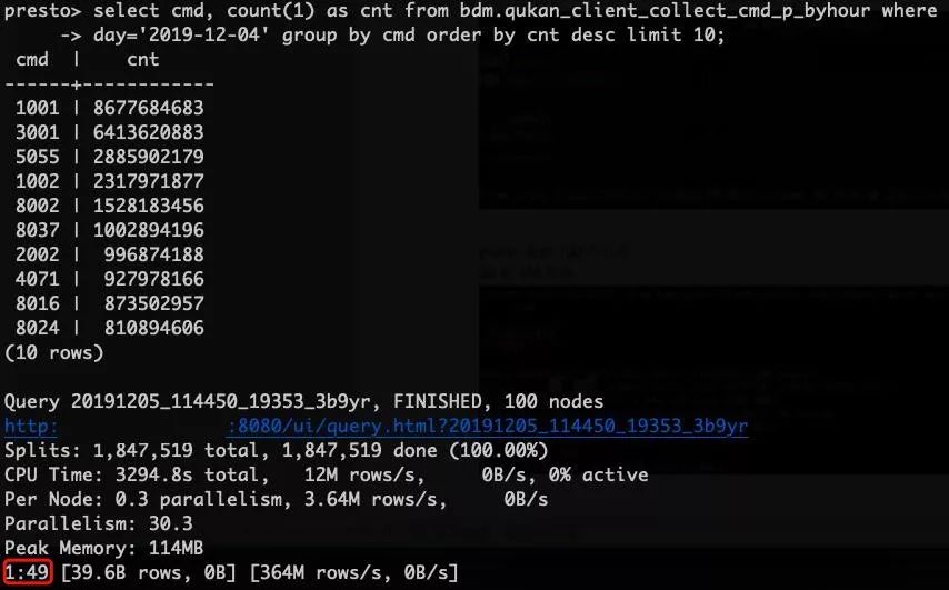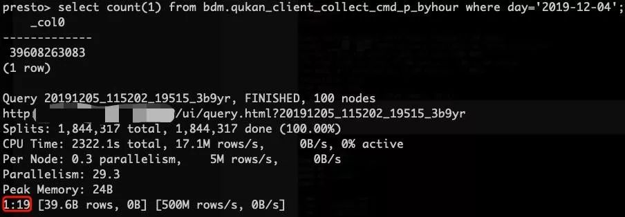 从上图可以看到clickhouse在count一个1100亿数据表只需要2s不到的时间, 由于数据冗余存储的关系,clickhouse实际响应该次查询的机器数只有30台(60 2),presto在count一个400亿的数据表耗时80秒左右的时候,100台机器同时在处理这个count的查询。