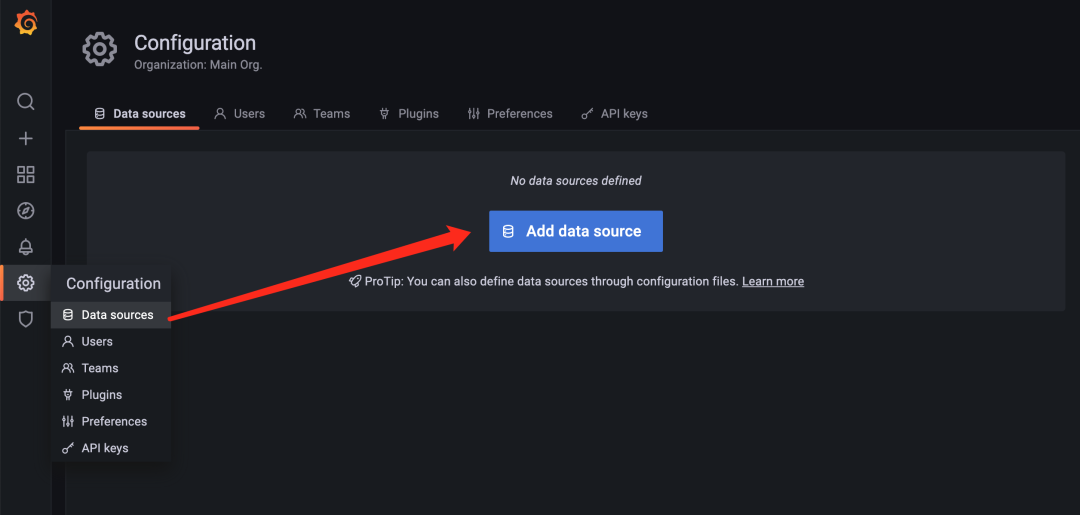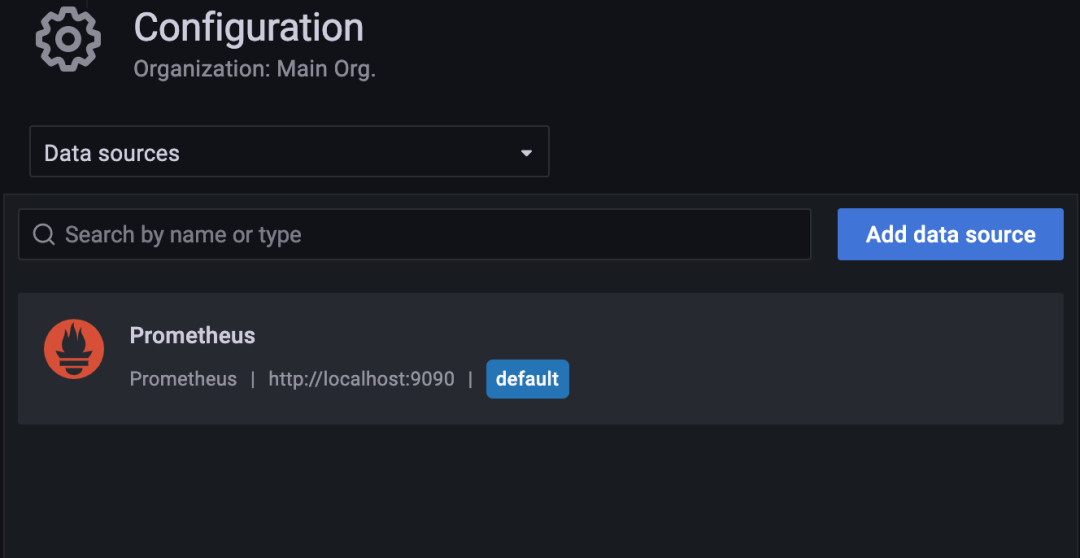 在创建面板之前我们需要指定我们的面板数据来源,也就是数据源,Grafana 支持多种数据源,我们这里当然使用 Prometheus 作为数据源来进行说明。在 Grafana 左侧工具栏选择 Configuration