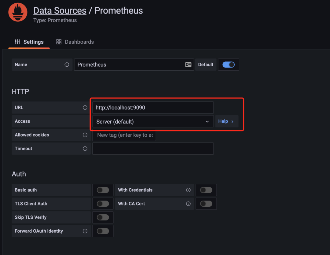 代理方式,这样就相当于 Grafana 程序去访问 Prometheus 而不是在浏览器端去访问,如果 Prometheus 配置有认证,则还需要在下发配置 Auth