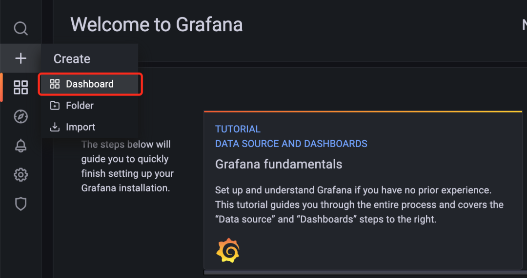 面板是属于某一个 Dashboard 的,所以我们需要先创建一个 Dashboard,在侧边栏点击 +
