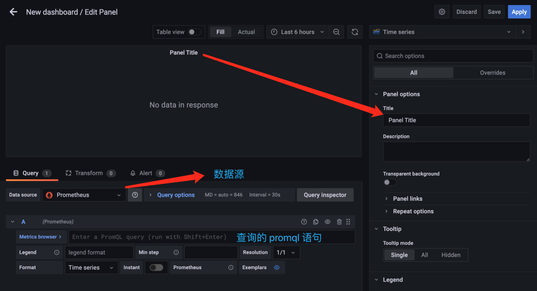 进入面板编辑器后即可添加面板了,中间位置是查询语句的显示结果,下方是用于配置查询语句的地方,左侧可以选择面板显示的类型,面板元信息,比如标题、描述信息等。