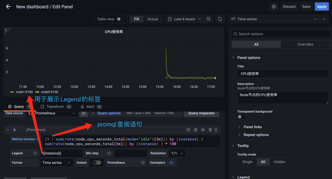 章节中已经学习了该监控数据的查询语句为 (1 - sum(rate(node_cpu_seconds_total{mode="idle"}[5m])) by (instance) / sum(rate(node_cpu_seconds_total[5m])) by (instance) ) * 100