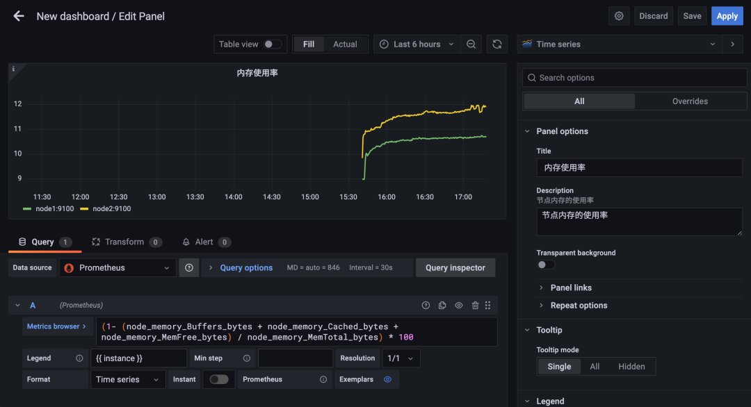用同样的方式我们可以创建一个用于查询节点内存使用率的面板: