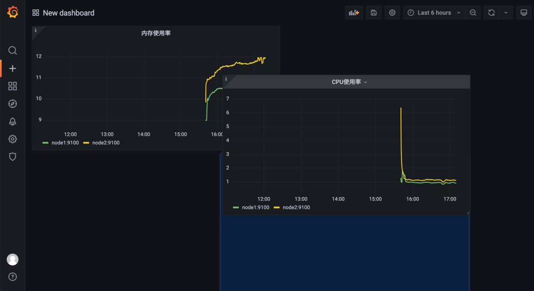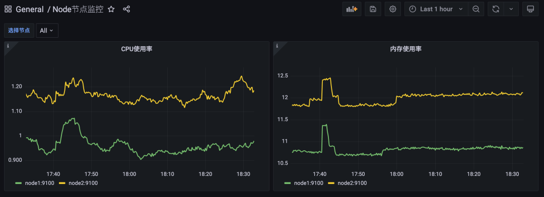 现在我们在一个 Dashboard 中添加了两个 Panel,我们可以很明显看到会直接将所有的节点信息展示在同一个面板中,但是如果有非常多的节点的话数据量就非常大了,这种情况下我们最好的方式是将节点当成参数,可以让用户自己去选择要查看哪一个节点的监控信息,要实现这个功能,我们就需要去添加一个以节点为参数的变量来去查询监控数据。