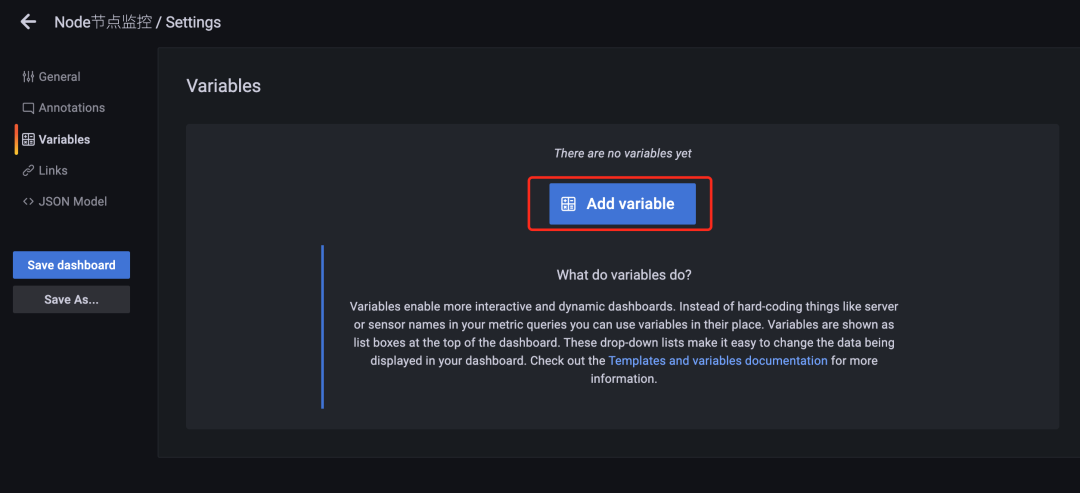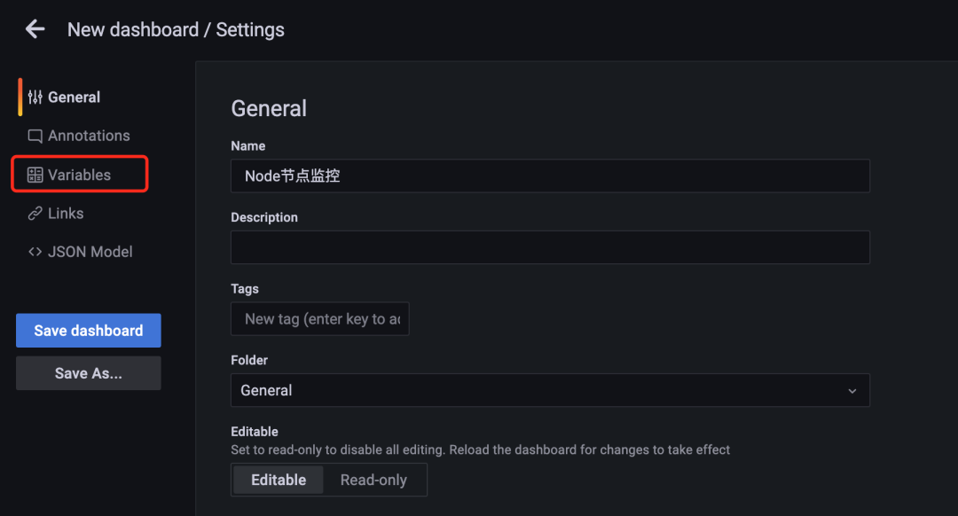页面可以来对整个 Dashboard 进行配置,比如名称、标签、变量等: