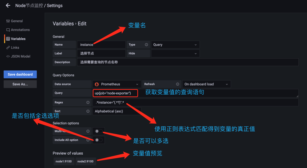 来获取实例数据,这样就成功定义了一个变量,回到 Dashboard 页面就可以看到多了一个选择节点