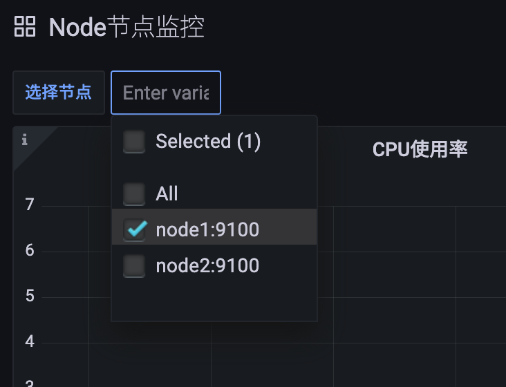 回到 Dashboard 页面就可以根据我们的下拉框来选择需要监控的节点数据了,定义参数的时候如果选择了可以选择所有,同样可以查看所有节点的数据: