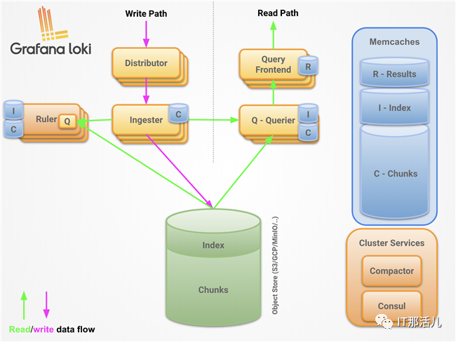Loki的设计理念收到了很多Prometheus的启发,可以实现可水平扩展、高可用的多租户日志系统。Loki整体架构也是由不同的组件来协同完成日志收集、索引、存储等工作的,各个组件如下所示,有关Loki架构的更多信息这里不再展开描述,可以参考官方文档Loki’s Architecture进一步深入了解。最后,一句话形容下Loki就是like Prometheus, but for logs。