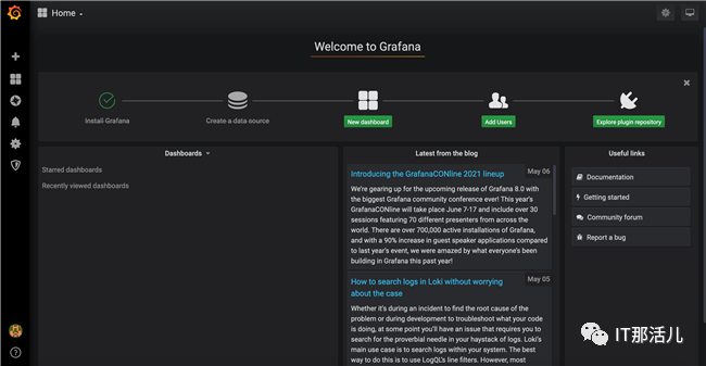 成功登录后可以正常进入到Grafana首页,如下图所示。