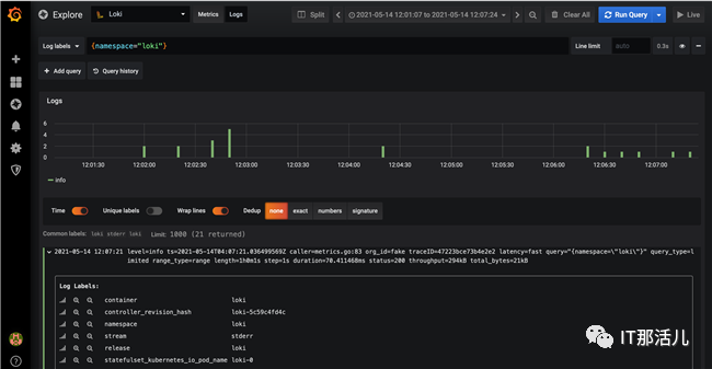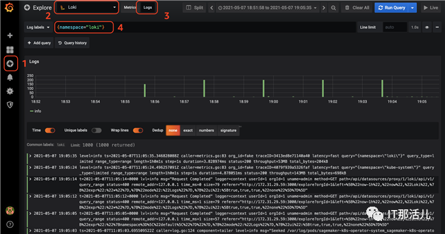 在Grafana侧边栏选择Explore进行快速日志查看,进入到Explore页面后选择Loki数据源,然后选择Logs标签,最后在Logs Labels中输入标签的查询条件,例如{namespace=”loki”},执行查询后就可以看到类似下图中的日志信息。