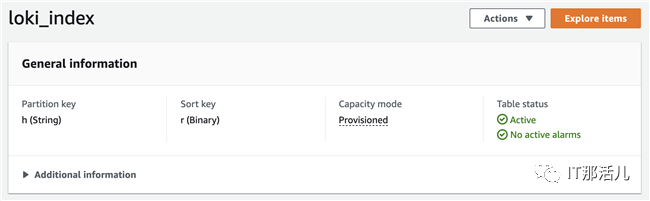 关于DynamaDB和S3的配置示例可以参考官方文档Loki Configuration Examples,详细的配置信息可以参考官方文档Configuring Loki。配置后的DynamoDB表使用h作为分区键,使用r作为排序键,如下图所示: