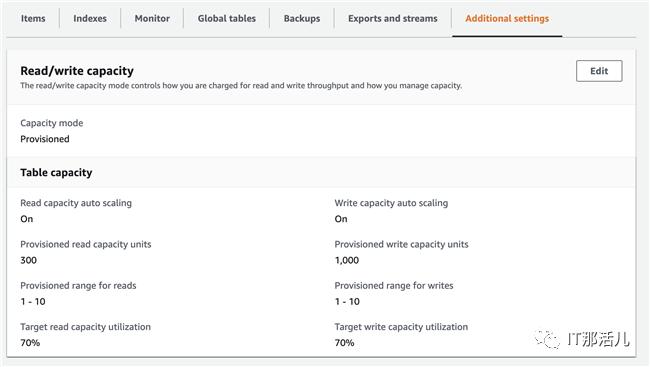 根据日志中的信息可以看到DynamoDB的WCU和RCU值配置为1000和300,如下图所示: