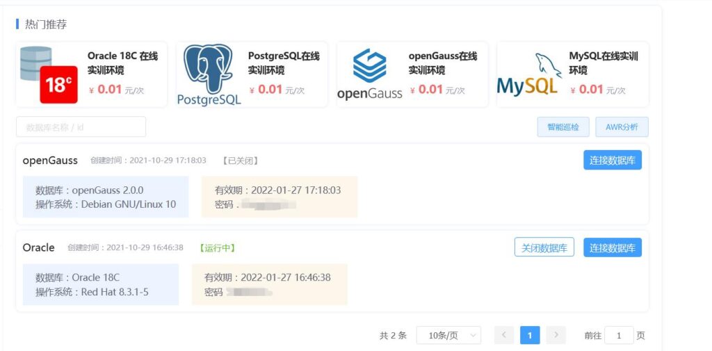 墨天轮社区最近发布了“数据库在线实训平台”(https://www.modb.pro/marketlist?type=1),目前支持Oracle、MySQL、Redis、PostgreSQL、openGauss和MogDB六类数据库。如果参加过国产数据库的一些线上培训认证的话,会接触到这种形式的数据库玩法,简而言之就是你可以在浏览器中的命令行窗口,做一些数据库命令的学习研究。