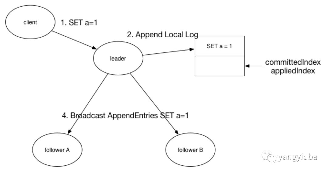 leader节点在本地添加一条日志,其对应的命令为SET a=1。这里涉及到两个索引值,committedIndex存储的最后一条提交(commit)日志的索引,appliedIndex存储的是最后一条应用到状态机中的日志索引值,一条日志只有被提交了才能应用到状态机中,因此总有 committedIndex >= appliedIndex不等式成立。在这里只是添加一条日志还并没有提交,两个索引值还指向上一条日志。