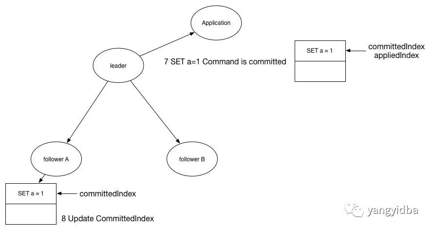 leader节点在下一次给follower的AppendEntries请求中,会带上当前最新的committedIndex索引值,follower收到之后同样会修改本地日志的committedIndex索引。需要说明的是,7和8这两个操作并没有严格的先后顺序,谁在前在后都没关系。