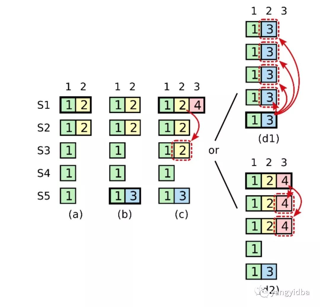 情况d1: s1崩溃,s5重新成为leader(投票给s5的是s4,s2和s5自身),那么index 2上的值3这一次成功的写入到集群的半数以上节点之上,并成功提交。