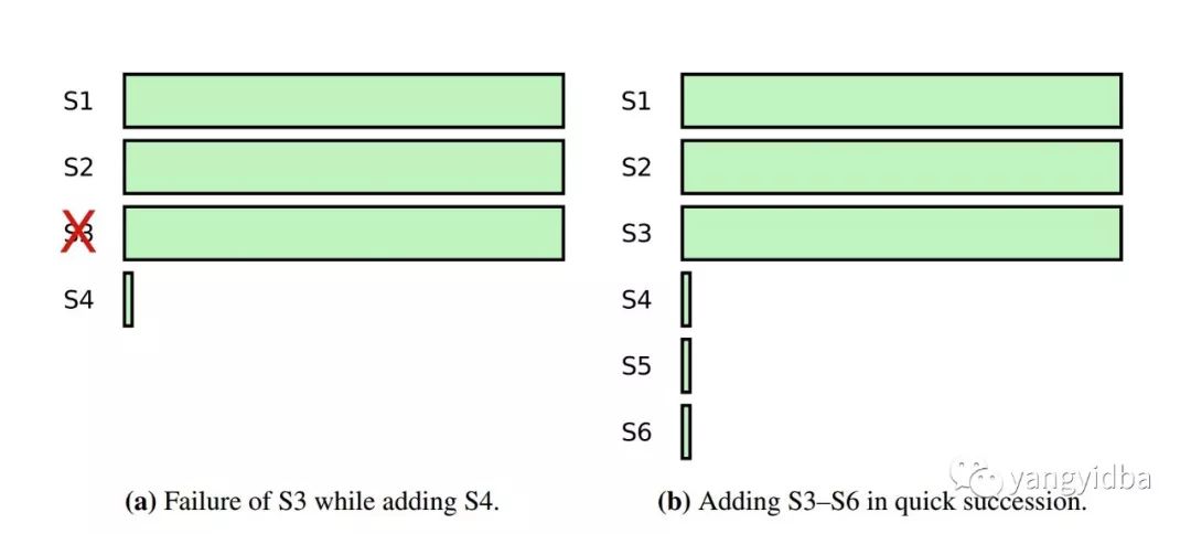 添加新节点到集群中 添加一个新的节点到集群时,需要考虑一种情况,即新节点可能落后当前集群日志很多的情况,在这种情况下集群出现故障的概率会大大提高,如下图所示。
