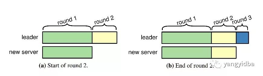 添加进来的新节点首先将不加入到集群中,而是等待数据追上集群的进度。leader同步数据给新节点的流程是,划分为多个轮次,每一轮同步一部分数据,而在同步的时候,leader仍然可以写入新的数据,只要等新的轮次到来继续同步就好。以下图来说明同步数据的流程。