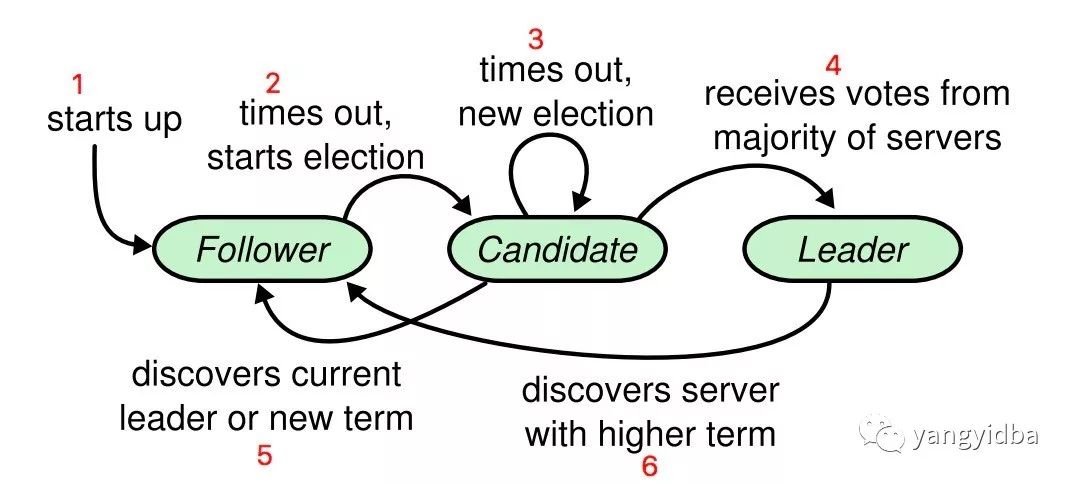 在Raft算法中,一个集群里面的所有节点有以下三种状态: