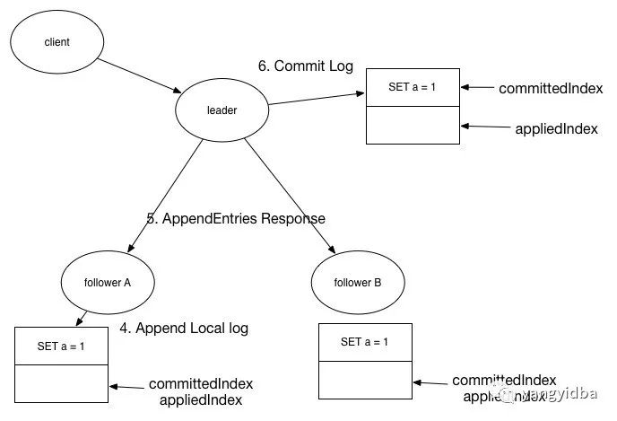 当leader节点收到集群半数以上节点的AppendEntries请求的应答消息时,认为SET a=1命令成功复制,可以进行提交,于是修改了本地committed日志的索引指向最新的存储SET a=1的日志,而appliedIndex还是保持着上一次的值,因为还没有应用该命令到状态机中。