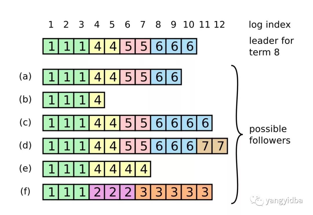 在正常的情况下,follower节点和leader节点的日志一直保持一致,此时AppendEntries RPC请求将不会失败。但是,当leader节点宕机时日志就可能出现不一致的情况,比如在这个leader节点宕机之前同步的数据并没有得到超过半数以上节点都复制成功了。如下图所示就是一种出现前后日志不一致的情况。