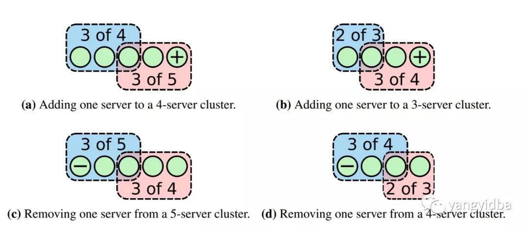 可以看到,不论旧集群节点数量是奇数还是偶数个,都不会出现同时有两个超过半数以上子集群的存在,也就不可能选出超过一个leader。