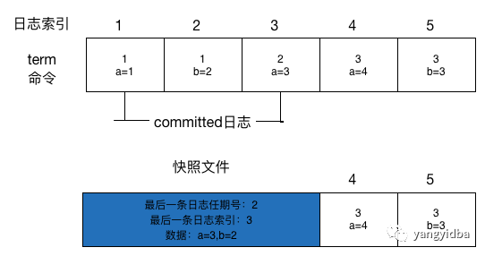 未压缩日志前,日志数据保存到了<3,5>的位置,而在<2,3>的位置之前的数据都已经进行提交了,所以可以针对这部分数据进行压缩。压缩日志之后,快照文件中存放了几个值:压缩时最后一条日志的二元数据是<2,3>,而针对a的几次操作最后的值为a=3,b的值为2。