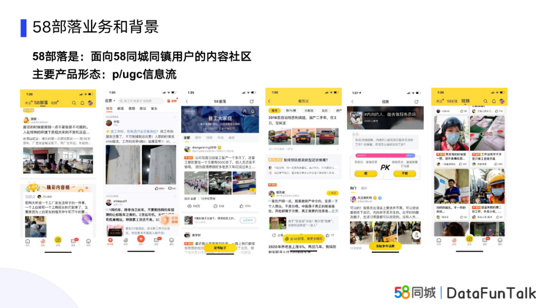 58部落是面向58同城同镇用户的内容社区,它的主要产品形态是PGC、UGC的信息流,其中物料主要有图文、视频、语音等,主要的展现形式则为图中的信息流,可以看到样式是比较丰富的。
