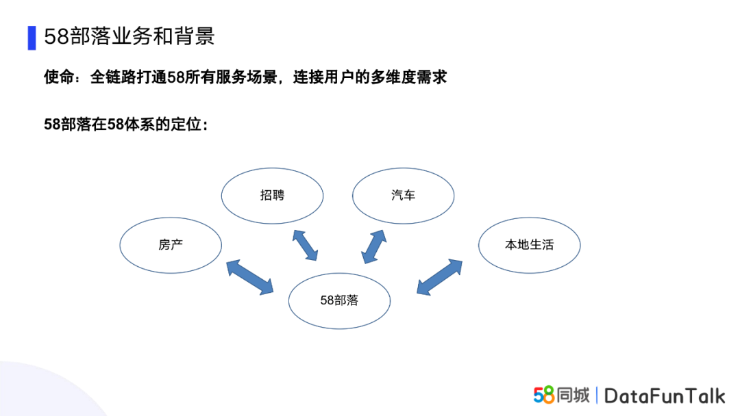 58部落的业务使命是全链路打通58所有服务场景,连接用户的多维度需求,从使命也就自然而然的可以联想到部落的定位:部落和58的房产、招聘、汽车、本地生活是共存的关系,但是58部落也有其不同点,和几大业务相互关联,并在其中起到了桥梁的作用。