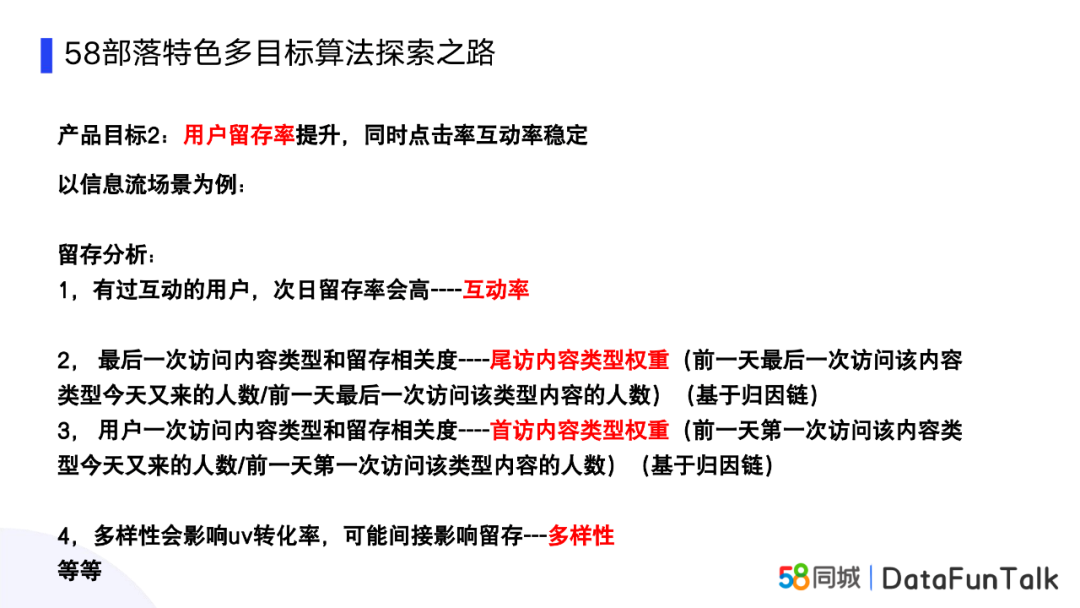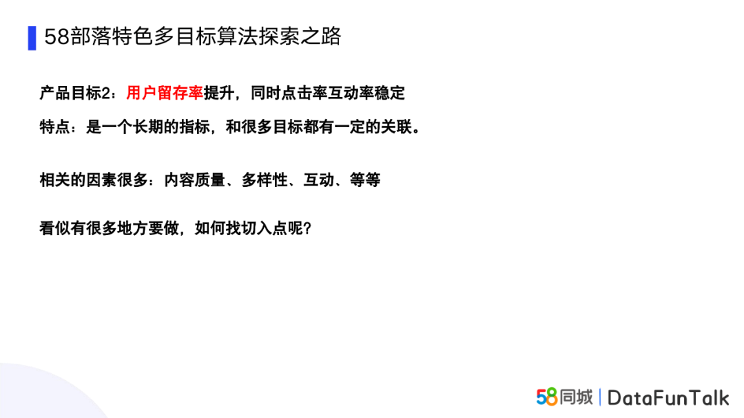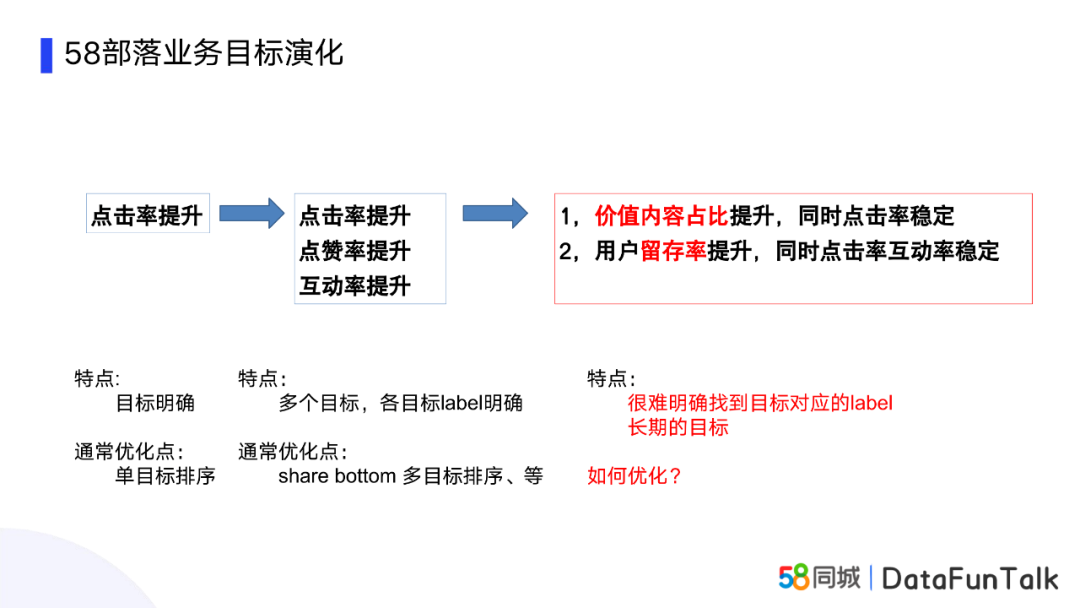这两个目标的特点在于,价值内容占比是一个事后数据统计的数据,很难明确找到目标对应的label;而用户的留存率更是一个长期的目标,很难通过一次点击或者互动去界定。