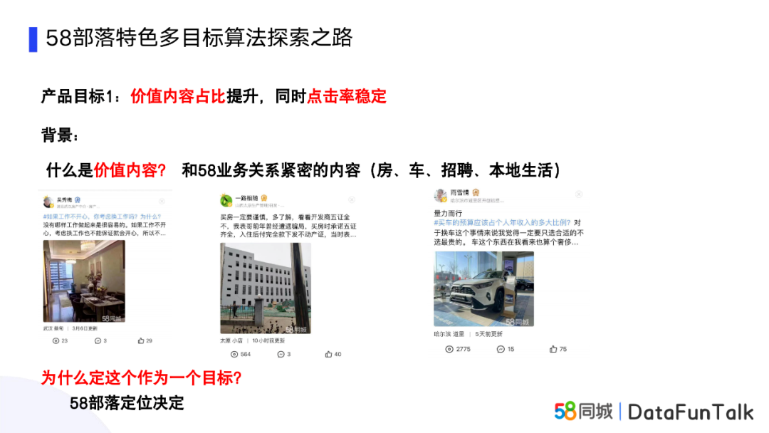 导读:58部落是面向58同城同镇用户的内容社区,主要产品形态为PGC、UGC的信息流,样式丰富。基于业务和背景,如何提升定义信息流价值内容占比,提升点击率、留存率、互动率等多个目标?今天就和大家分享基于58部落业务目标,特色广义多目标算法的探索过程与实践。主要内容包括:① 58部落业务和背景;② 58部落的业务目标演化;③ 58部落特色广义多目标算法探索过程与实践。