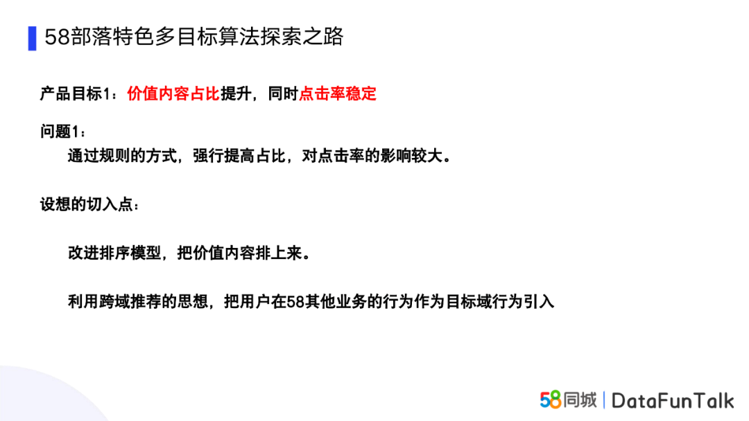 最简单的方式就是通过规则,强行提高价值内容的占比,但是缺点就是对点击率的影响较大。而我们认为理想的切入点是改进排序模型,把价值内容自然而然的排上来。思考点就是,利用跨域推荐的思想,把用户在58其他业务的行为作为目标域行为进行引入,相当于是增加了58其它业务和58部落的内在联系,基于这种假设,希望把价值内容排序上来。