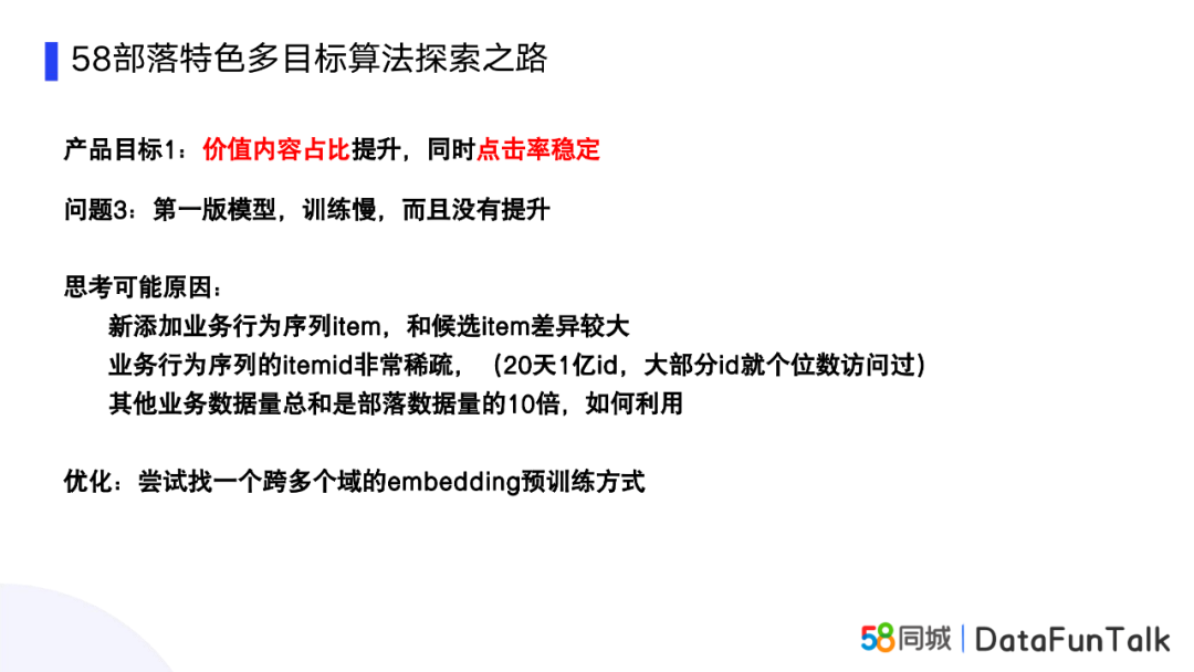 第一版的朴素模型也暴露了不少问题,训练慢,也没有什么提升,虽然加了其它业务线的一些特征,但是训练之后,上层的特征权重是非常小的,也就是说整体上基本是不起作用的。针对于这个问题,我们思考了几个可能的原因: