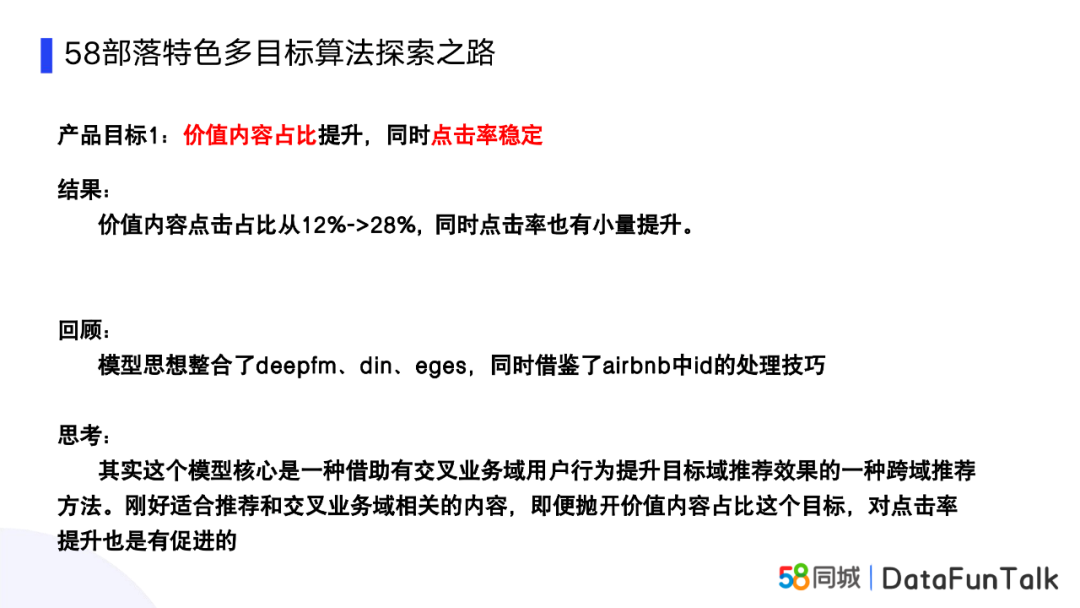 上线后的结果是价值内容点击占比从12%提升到28%,同时点击率也有小量的提升,满足产品的预设目标的。回顾一些这个方法的思路,模型融合了DeepFM、DIN、EGES,同时也借鉴了Airbnb中Id的处理技巧,使得价值内容占比和点击率获得了提升。其实这个模型的核心总结来看,是一种借助有交叉业务域用户行为提升目标域推荐效果的一种跨域推荐方法,刚好适合推荐的交叉业务域相关的内容,本事上可以理解为增加了相关域的特征,但即便抛开价值内容占比这个目标,对点击率的提升也是有促进的。