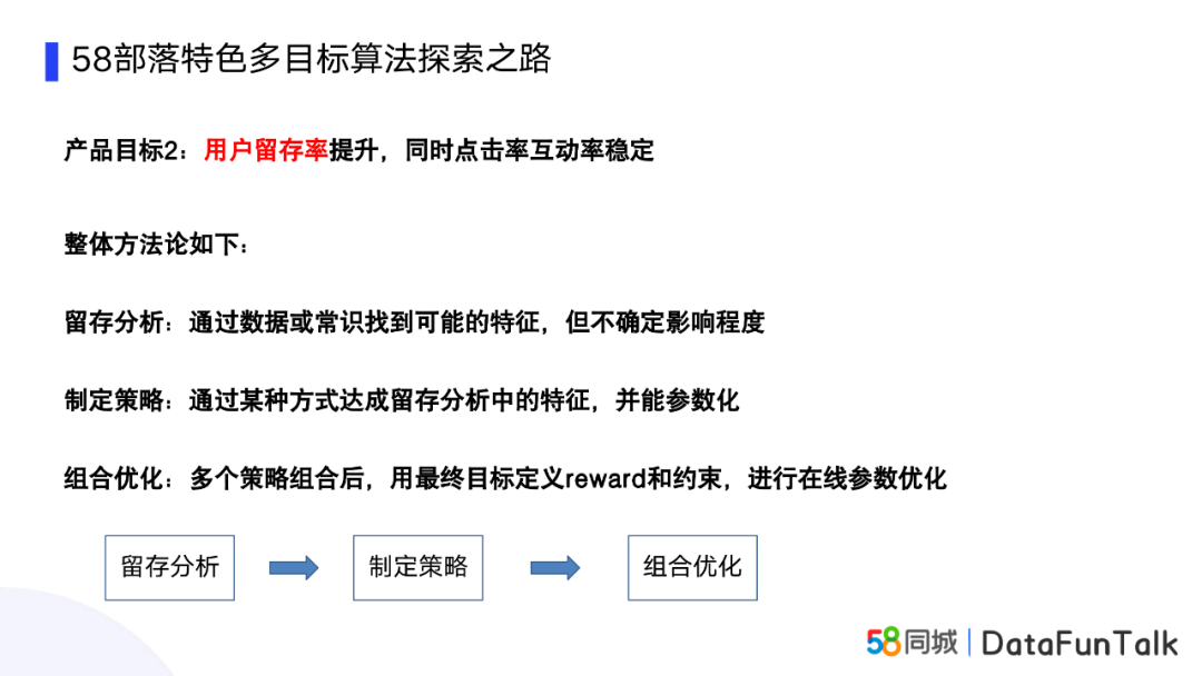 想要用户的留存率提升,首先要进行留存分析,也就是通过数据或常识找到可能的特征,但是不能确定其影响程度;然后根据留存的分析进行策略的制定,来对结果进行干预,也就是通过某种方式达成留存分析中的特征,并能参数化;最后将制定的多个策略组合进行优化,用最终目标定义reward和约束,进行在线的参数优化,达到最终目标提升。