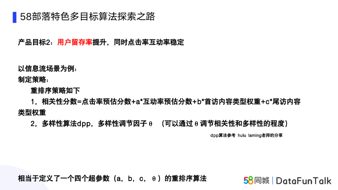 这里相当于定义了一种重排序的策略,通过重排的方法,照顾上述的四个因素,相关性分数=点击率预估分数+a*互动率预估分数+b*首访内容类型权重+c*尾访内容类型权重;有了相关性分数,参考Hulu laming老师的多样性dpp算法,使用多样性调节因子θ,以此调节相关性和多样性的程度,这里也就相当于定义了一个四个超参数(a,b,c,θ)的重排序算法。