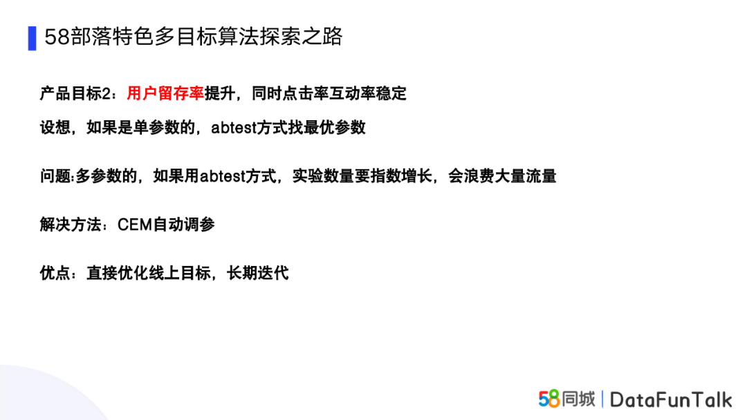 设想如果是单参数的,可以使用abtest的方式,把参数都试一遍,找最优的参数;但如果是多参数,使用abtest的方式,实验数量要指数增长,会浪费大量流量,针对于这个问题,我们找到一种调参方式,使用CEM自动调参,优点就是可以直接优化线上目标,实现长期的迭代。