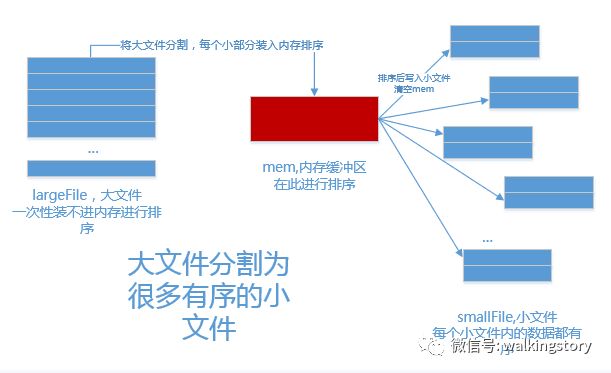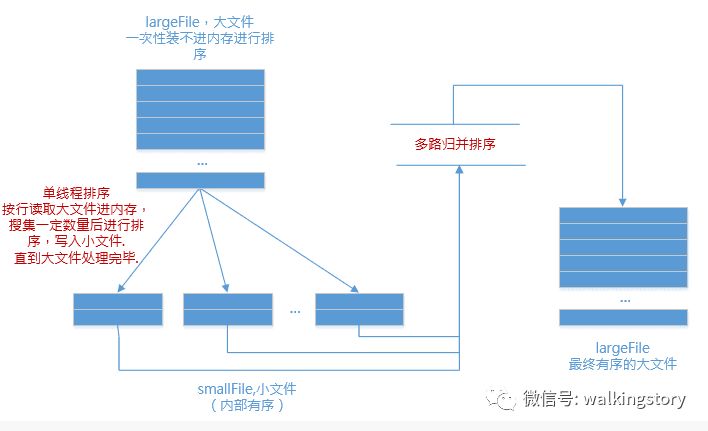 内存极少的情况下,利用分治策略,利用外存保存中间结果,再用多路归并来排序;