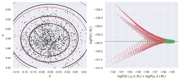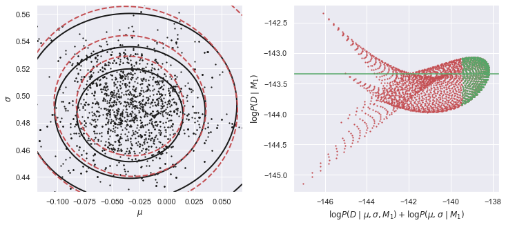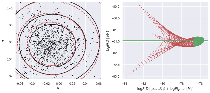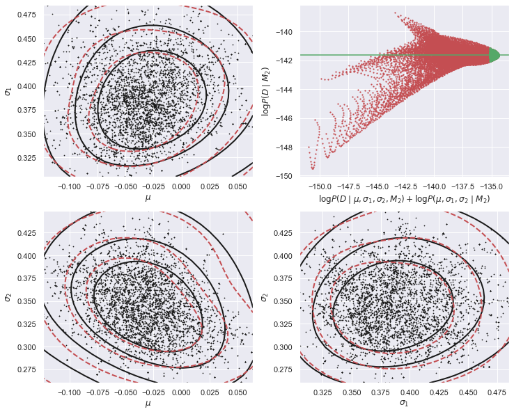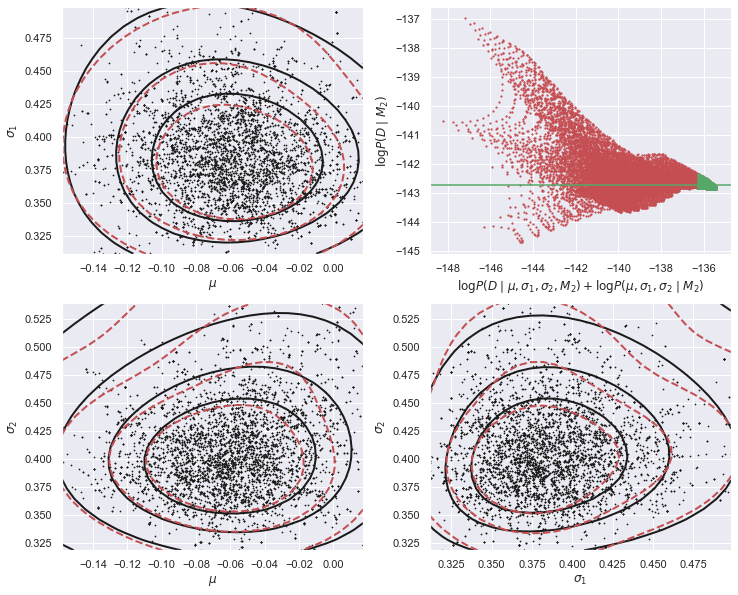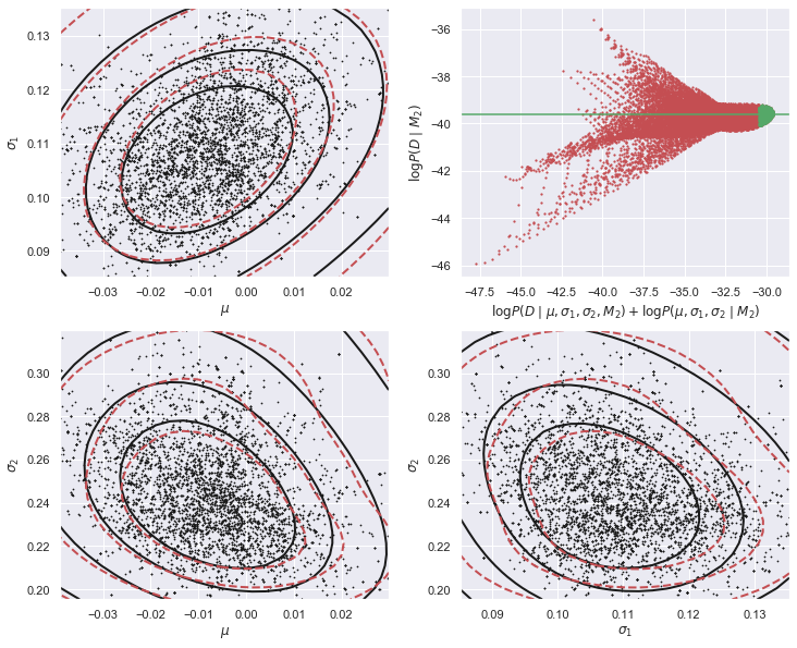在上面的左图中,黑色实线表示未归一化后验的形状,红色虚等高线表示GMM密度模型与MCMC样本的吻合。两者并不需要完全一致,但一致性越佳将意味着更准确的估计证据 。在这个例子中,我们使用的是单一成分的GMM,但后验分布表现轻微的非高斯分布,所以可以尝试增加MCMC样本的数量,并添加另一个GMM成分。