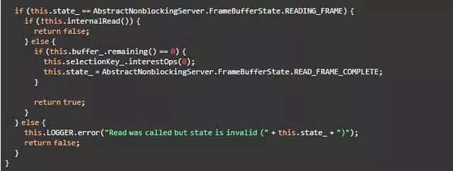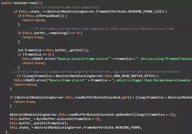 可以排除掉没有及时清除缓存的可能,方向明确,极大的可能是在申请NIO缓存的时候出现了问题,回到thrift框架,查看FrameBuffer的read方法代码: