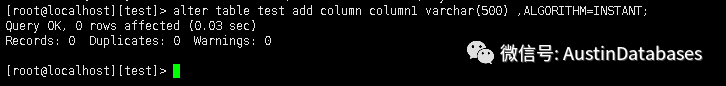 alter table test add column column1 varchar(500) ,ALGORITHM=INSTANT;