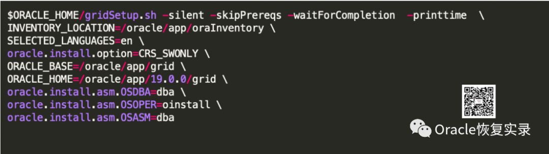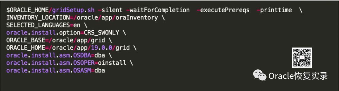 在12C的版本中,软件的安装不在需要配置文件,可以直接在命令后面接参数,会自动的生成参数文件,相比之前的版本,已经非常简单了。这里只安装软件,不配置集群,所以需要的参数是非常少的。