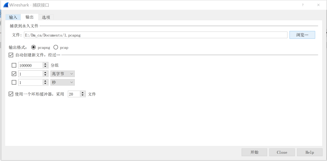 文件保存路径:需要设置具体的文件名,wireshark会自动在文件名后加上序号和时间戳信息。比如文件名为