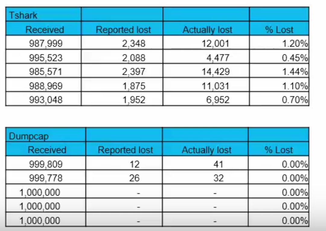 具体相关测试可以到Wireshark Packet Capture: Tshark Vs. Dumpcap查看,里面还有更多的不同的基准测试结果。(可能需要翻墙)。