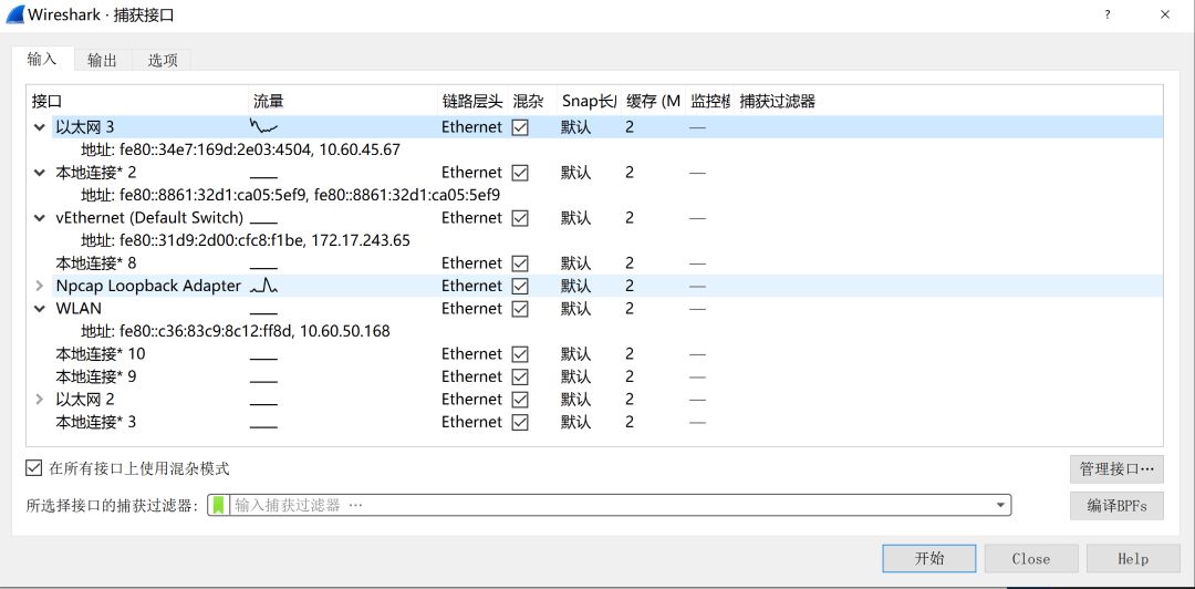 通常来说我们需要抓取某个ip的包,那么我们需要知道这个ip是那个网络接口。通过dumpcap -D