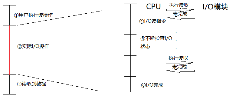 为了更好的说明中断带来的性能提升,我们先描述一下没有中断时程序如何处理I/O操作。